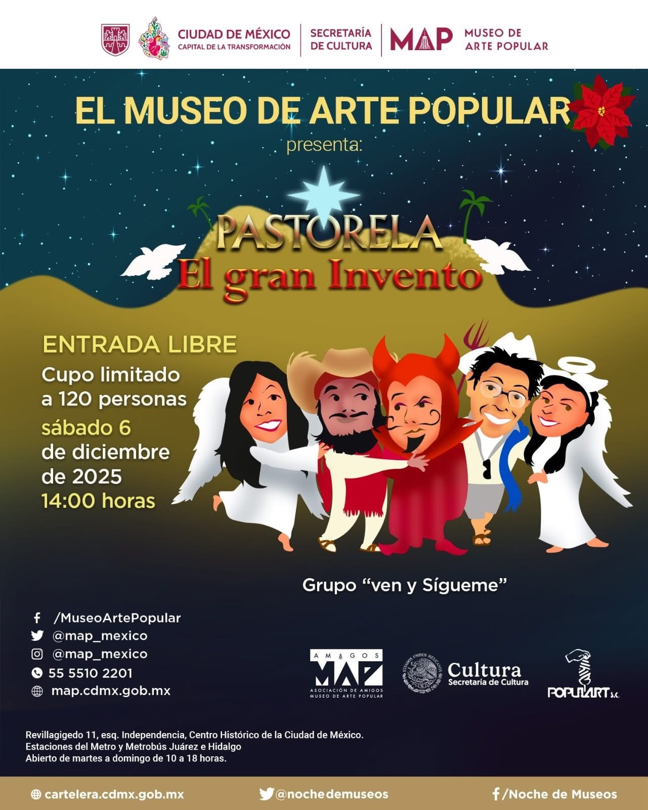 Pastorela El gran Invento admin diciembre 4, 2025 artepopular Pastorela El gran Inventomap.cdmx.gob.mx Navegación de entradas Anterior Entrada anterior: Arte/Sano entre Artistas 8.0Siguiente Entrada siguiente: 19° Concurso de Papalotes del MAP